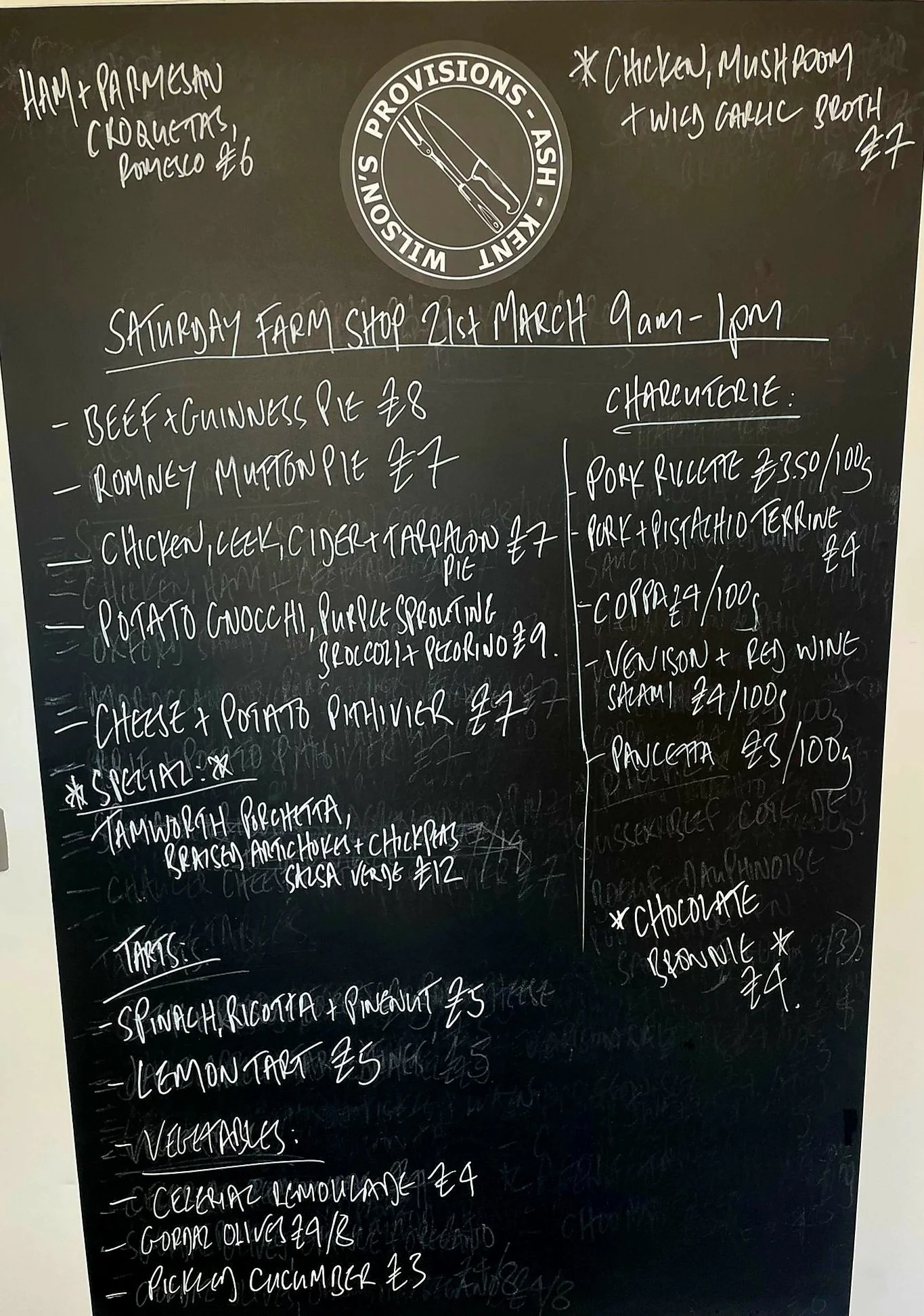 Please see this week’s menu on the blackboard, email tim@wilsonsprovisions.com if you want to pre - order any items to avoid disappointment.
